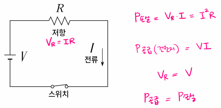 회로에 전류 I가 흐를 때 저항 R에서 전기 에너지가 열 에너지로 전환됩니다. 이 전환 비율이 손실 전력입니다. 이러한 전기 에너지의 공급원은 회로에 건전지 말고는 없어 보입니다. 전위차를 유지하여 지속적으로 전류 I를 흐르게 하는 능력, 건전지의 기전력은 화학 에너지에서 비롯됩니다. 다시 말해 건전지는 화학 에너지의 형태로 전기 에너지를 저장하는 소자예요.
