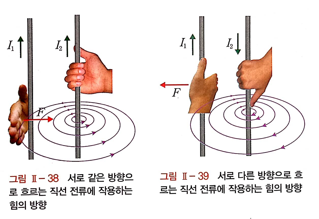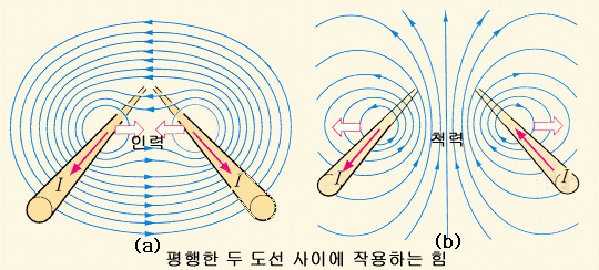 서로 다른 방향으로 전류가 흐르는 평행한 두 도선 사이에는 척력이 작용하고, 서로 같은 방향으로 전류가 흐르는 평행한 두 도선 사이에는 인력이 작용합니다.