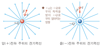 전기력선은 +전하에서 나가는 방향이며, -전하로 들어오는 방향을 보입니다. 자기장 또한 N극에서 나가는 방향, S극으로 들어오는 방향을 보입니다.