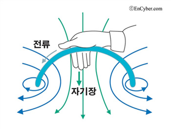 자기장의 방향은 오른손을 이용하여 확인할 수 있습니다. 오른손 엄지손가락이 가리키는 방향을 전류가 흐르는 방향으로 맞춘 상태에서 감싸지는 네 손가락의 방향이 자기장의 방향입니다.