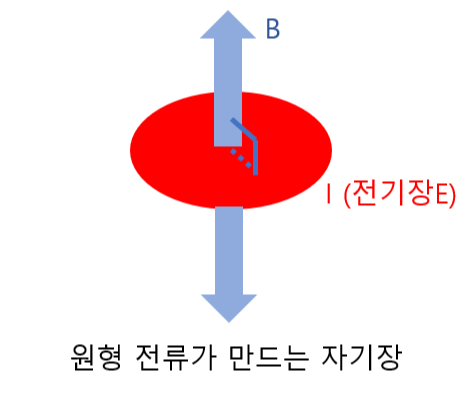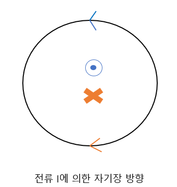 직선 도선을 원형으로 구부리면 도선의 각 부분에 흐르는 전류에 의한 자기장이 해당 영역 근처에 형성됩니다. 원형 전류는 직선 전류를 구부린 거 그 이상 그 이하도 아니에요. 따라서 원형 도선 중심의 자기장 세기는 전류의 세기 I에 비례하고, 원형 도선의 반지름 r에 반비례합니다.
