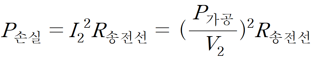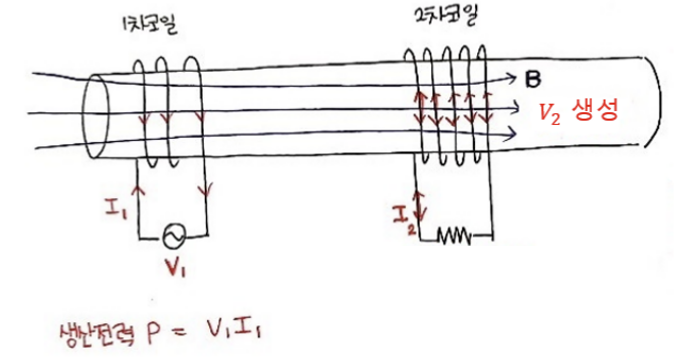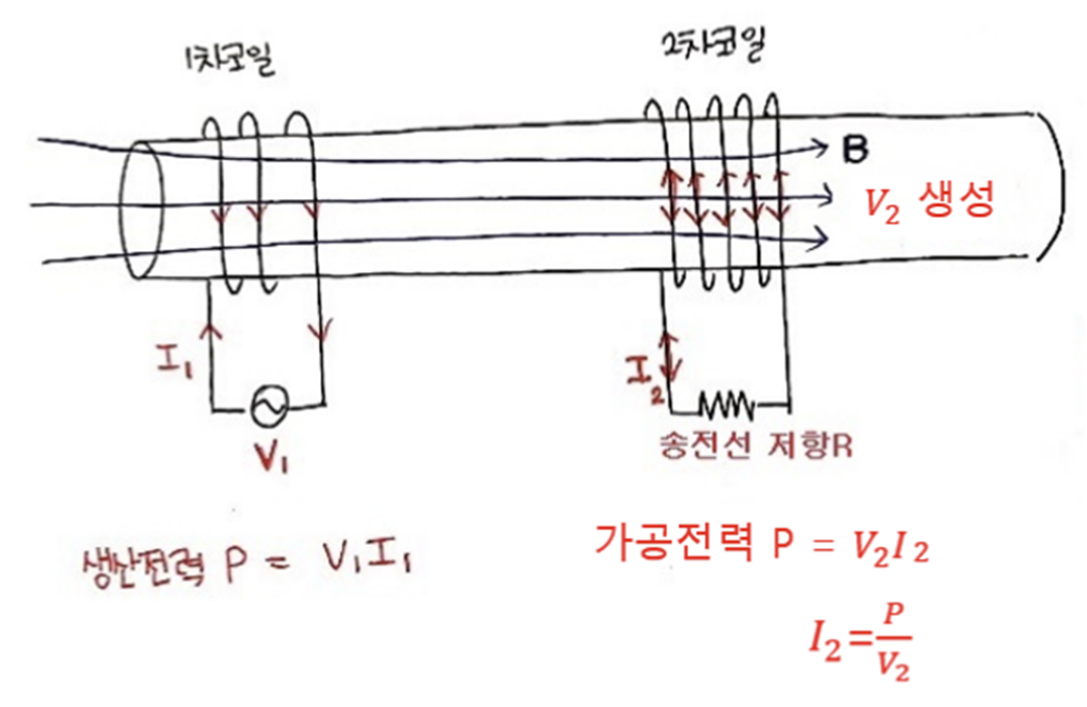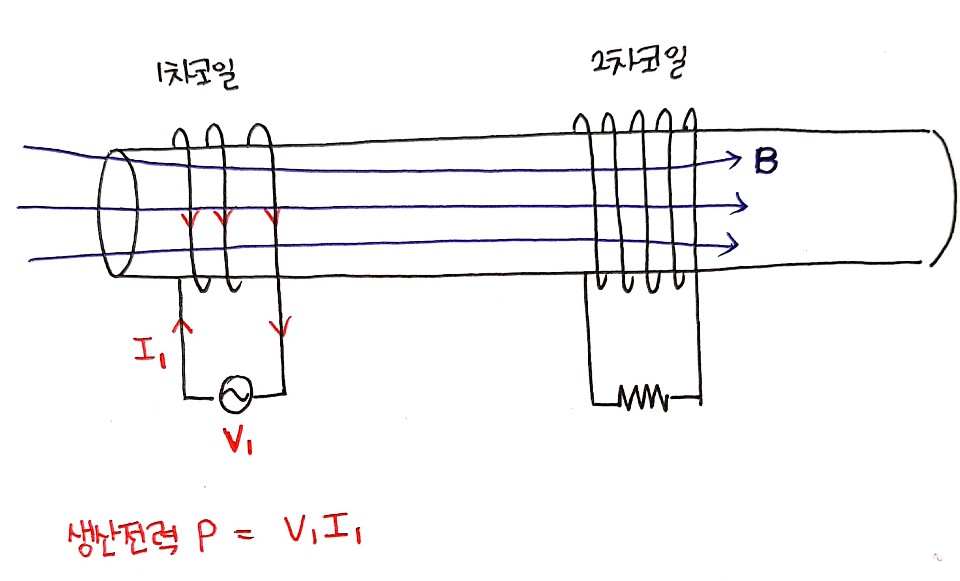 발전소에서 생산되는 전력 P는 1차 코일에 걸리는 전압 V1과 1차 코일에 흐르는 전류 I1의 곱으로 정의됩니다. 비유하자면 발전소에서 생산되는 전력이 1차 코일에 머물러 있는 형태입니다. 이 머물러 있는 생산 전력을 송전하기 위해 가공 처리하는 작업이 2차 코일에서 일어납니다.