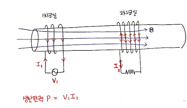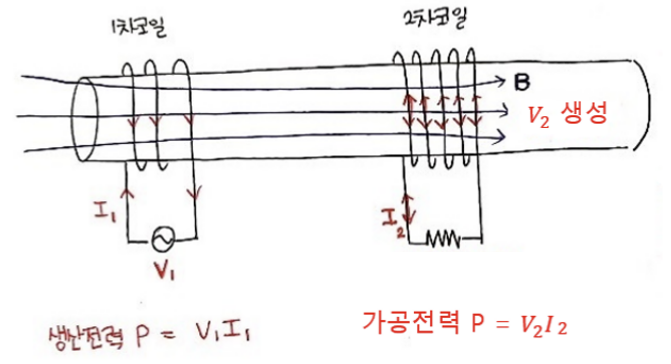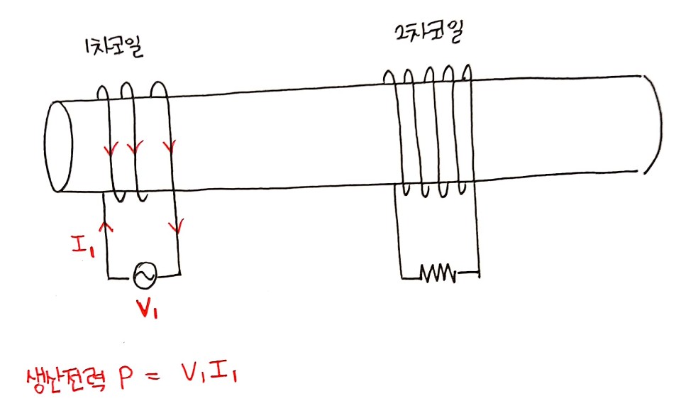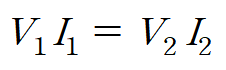 변압기에서 전력 손실이 없다면, 에너지 보존 법칙에 의해 1차 코일의 생산 전력과 2차 코일의 가공 전력이 같습니다.