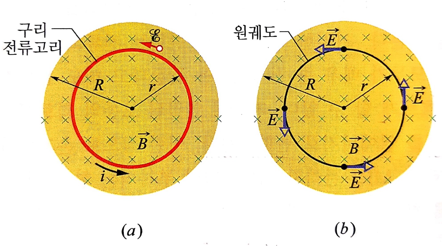 (a)는 변하는 자기장 영역에 놓인 반지름 r인 구리 고리에 유도된 기전력으로 인해 반시계 방향으로 흐르는 유도 전류를 나타낸 그림입니다. 따라서 유도 전기장 또한 반시계 방향의 고리 모양을 띠고 있음을 나타낸 그림이 (b)입니다. 네. 유도 전기장의 형태 자체가 전하 주위의 전기장 형태와 아예 다르죠. 따라서 유도 전기장에서 비롯된 유도 기전력과 전하 주위의 전기장에서 비롯된 전지의 기전력은 다릅니다.