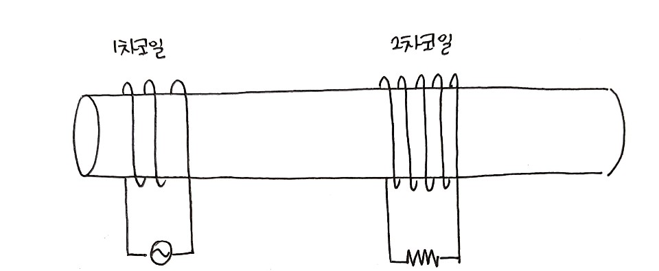 그림과 같이 변압기는 ㅁ자 형태의 철심에 코일을 감은 구조입니다. 쉬운 이해를 위해 ㅁ자 형태의 철심을 오른쪽 그림처럼 일렬로 펴보겠습니다.