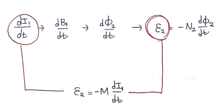 한 코일에서의 전류 변화가 이웃한 코일에 유도 기전력을 만드는 현상을 상호 유도라 합니다. 1차 코일의 전류가 변하면 1차 코일이 만드는 자기장 B1이 변하고, 그에 따라 2차 코일을 지나는 자기선속이 변하여 2차 코일에 유도 기전력이 생성됩니다.