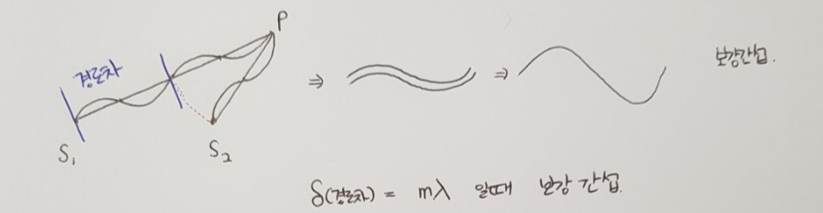 S2에서 p까지 수면파가 한 파장 λ을 이동할 때, 위상이 같은 또 다른 수면파는 S1에서 p까지 두 파장 2λ을 이동한다고 가정할게요. 이때 두 파동의 경로가 한 파장 λ만큼 차이가 나는데요. 이처럼 두 파동의 경로 차이 δ가 파장의 정수배(=반파장의 짝수배)에 해당되는 지점 p에선 두 파동이 같은 위상으로 만나기 때문에 보강 간섭이 일어납니다.