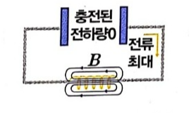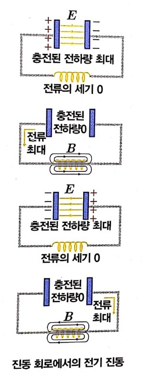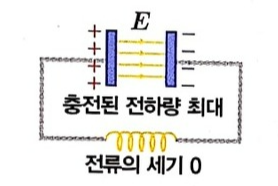 축전기와 코일이 연결돼 있는 회로를 LC 회로라고 합니다. 축전기가 완전히 충전된 상태에서 회로의 스위치를 닫으면 오른쪽 그림에서 볼 수 있듯이 전자기적 진동 현상이 발생합니다.