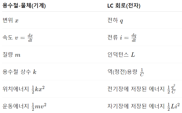 축전기의 전기 에너지와 코일의 자기 에너지가 서로 주기적으로 전환되는 전자기적 진동은 용수철의 탄성 퍼텐셜 에너지와 물체의 운동 에너지가 서로 주기적으로 전환되는 단진동과 매우 비슷합니다.