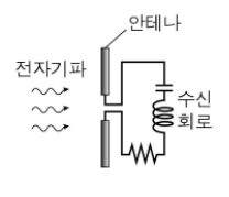 안테나에 연결되어 있는 축전기의 전기용량 C와 코일의 리액턴스 L를 조절하여 수신 회로의 공명 진동수를 결정하면, 안테나가 수신한 여러 전자기파 중 수신 회로의 공명 진동수와 결이 맞는 특정 진동수의 전자기파만을 선택할 수 있습니다.