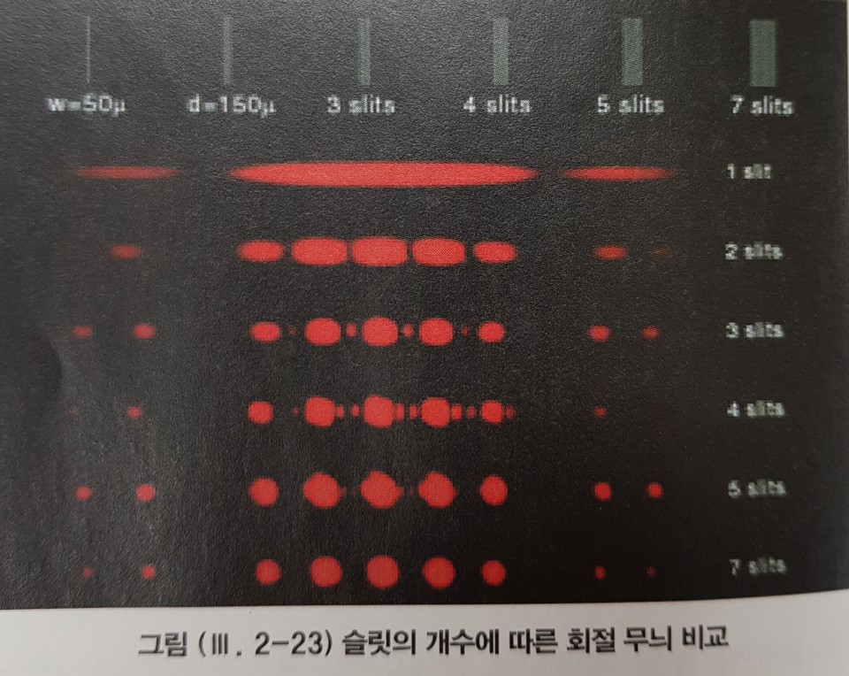 그림을 보면 슬릿의 개수가 많아질수록 밝은 무늬들의 폭이 줄어들면서 무늬 간의 분리가 선명하게 잘됨을 확인할 수 있습니다. 이처럼 슬릿의 개수가 많을수록 빛을 분해하기 쉬워요.