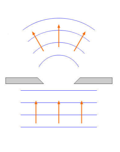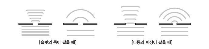슬릿의 폭에 따라 수면파가 회절 되는 모양은 위 그림과 같습니다. 파장이 길고 슬릿의 폭이 좁을수록 파동의 회절 효과는 크게 나타납니다.