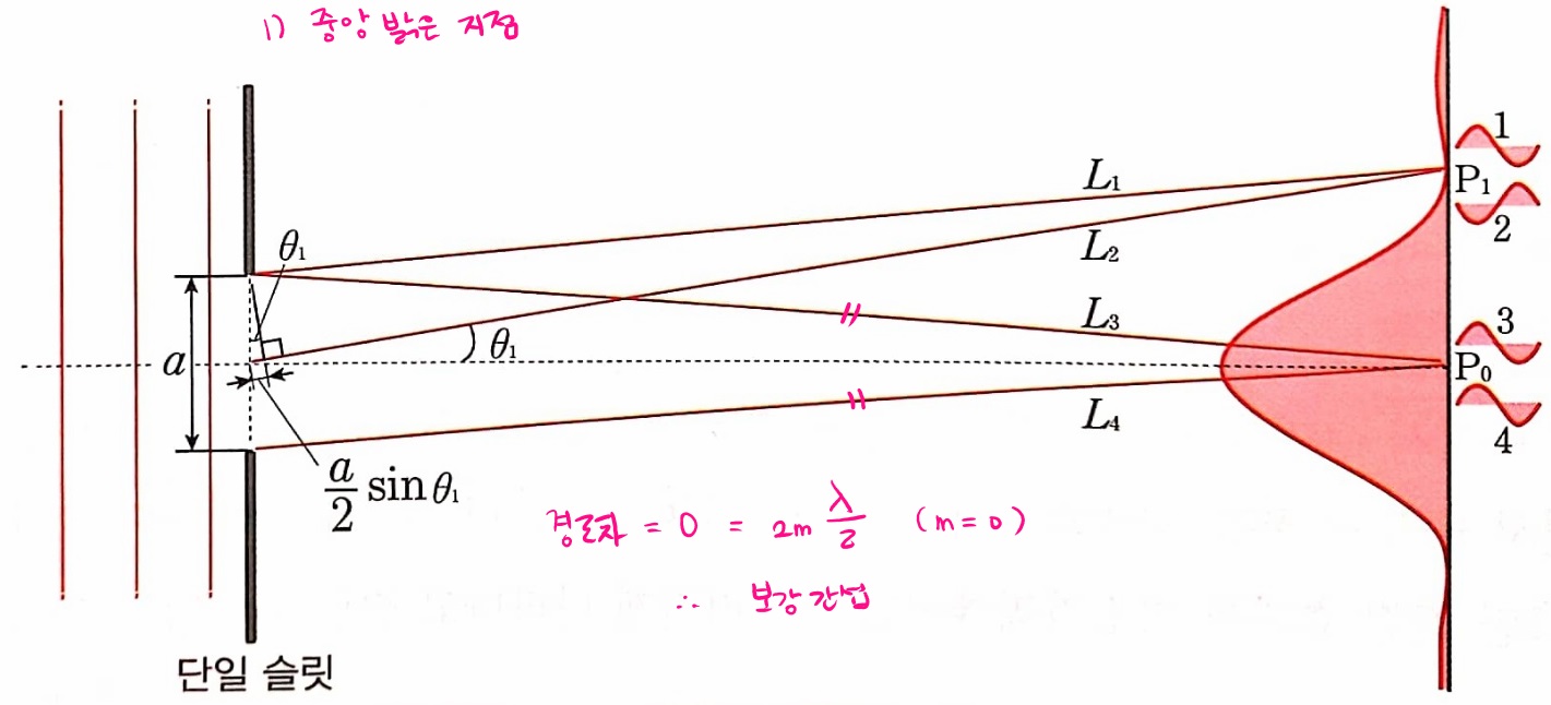 슬릿에서 스크린의 중심점인 P₀까지 도달하는 파동들은 모두 같은 거리를 이동하므로, 경로차가 0이 되어 밝은 무늬(=보강 간섭)가 생성됩니다.