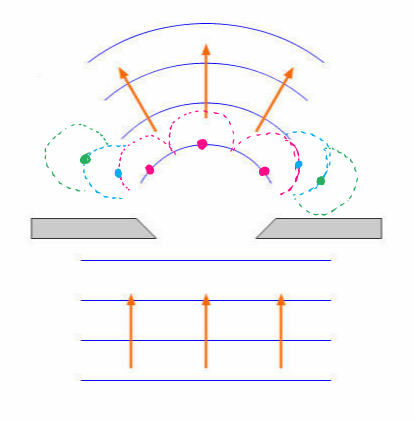 틈을 통과하는 파면 상의 임의 점이 점파원 역할(=분홍색 점)을 하고, 분홍색 점파원에서 발생하는 파면 상의 임의 점(=파란색 점)역시 점파원 역할을 하고, 파란색 점파원에서 발생하는 파면 상의 임의 점(=초록색 점)또한 점파원 역할을 합니다. 이는 전체적으로 틈을 통과한 파동이 주변으로 퍼져 나가는 듯한 형국을 연출합니다. 이를 회절이라 해요.