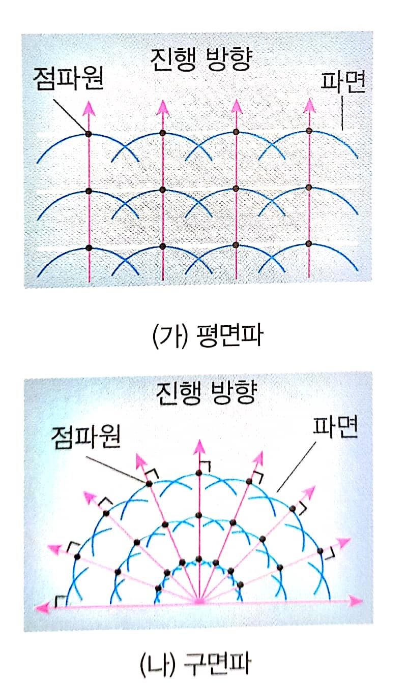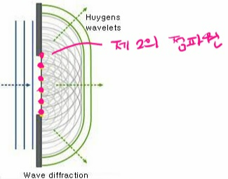파동이 전파할 때 각 파면 위의 모든 점은 새로운 점파원이 되어 구면파를 발생시키고, 발생된 구면파들의 접면이 새로운 파면이 됩니다. 이를 이용하여 회절 현상을 설명할 수 있어요.