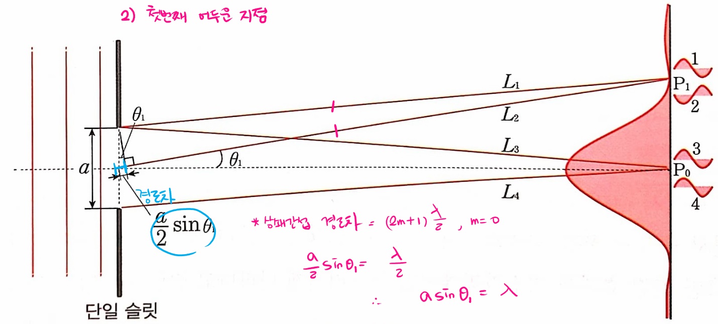스크린의 P1은 중앙의 밝은 무늬로부터 첫 번째 어두운 무늬가 생기는 곳입니다. 그리고 θ1는 슬릿에서 스크린 중심 O을 향하는 기준선과 슬릿에서 P1으로 가는 선 사이에 끼인 각입니다.
