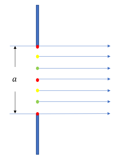 간격이 a인 단일 슬릿을 통과한 파면 상의 모든 점 각각을 하나의 광원으로 취급할게요. 다음과 같이 슬릿 정중앙의 광원(빨강)을 포함하여 7개의 광원을 가정하겠습니다. 그리고 색별로 광원의 짝을 지어줄게요.(빨강-빨강 짝, 노랑-노랑 짝, 초록-초록 짝)