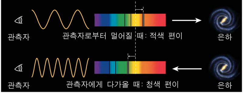 광원이 관측자로부터 멀어지면 빛의 파장이 길어지고(=적색 편이), 관측자에게 가까워지면 파장이 짧아지는(=청색 편이) 도플러 효과가 나타납니다.