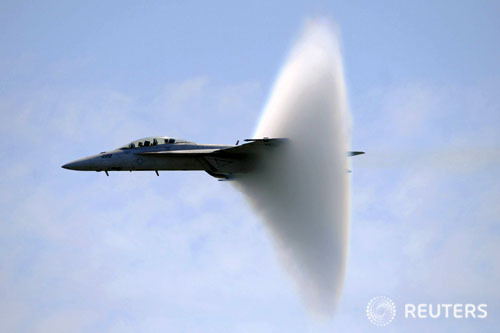 초음속으로 움직이는 전투기를 휩싸고 있는 구름은 무엇 때문에 생긴 것일까요? 이는 급격히 증가하는 공기 압력을 따라 응축된 수증기가 공기의 압력이 급격히 감소하는 과정에서 수증기가 팽창하기 때문에 발생한 것입니다.
