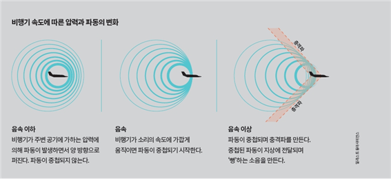 파원의 속력이 소리의 속력을 초월하는 경우, 파원 앞의 공기 압력이 급격히 증가했다가 급격히 감소하는 과정에서 엄청난 굉음이 발생합니다. 이를 충격파라 해요.