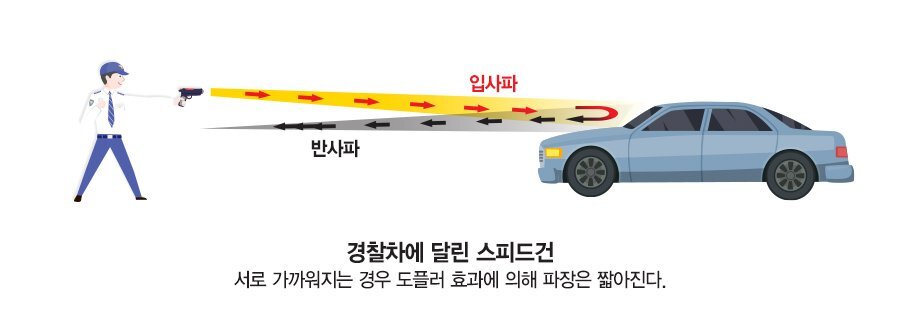 스피드건에서 발생된 전파는 마주 오는 자동차에서 반사되어 다시 스피드건으로 돌아옵니다. 이때의 도플러 효과에서 기인한 진동수의 증가를 토대로 자동차의 속력을 측정해요.