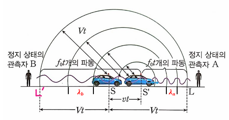 그림과 같이 정지해 있는 관측자 A를 향하여 일정한 진동수 f0인 파원이 속도 v로 다가오는 경우를 생각해 봅시다. 음파의 속도를 V라 하면, t초 동안 음원은 S'에 도착하게 되고, 그동안 음원에서는(fo × t)개의 파면이 생성됩니다. 진동수란 1초 동안 몇 번의 진동이 일어나는지를 가리키는 물리량으로, 음원에서 한 번 진동이 일어나면 새로운 파면(=파동의 골 또는 마루)이 하나 만들어집니다. 따라서 진동 횟수 = 생성된 파면의 개수라고 볼 수 있어요.