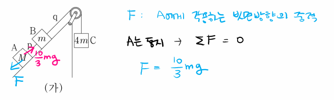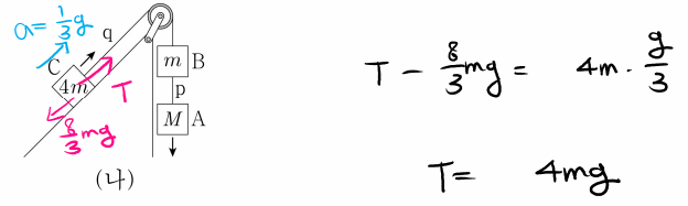 B에 작용하는 빗면 방향 중력이 2/3mg, A에 작용하는 빗면 방향 중력이 10/3mg였다. 같은 빗면에 질량이 4m인 C에 작용하는 빗면 방향 중력은 질량에 비례하므로(같은 빗면에서 같은 가속도로 운동함) 크기가 8/3mg이다.