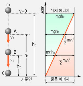 중력이 작용하는 공간과 탄성력이 작용하는 공간에서 '일-에너지' 정리를 이용하여 각 힘이 한 일과 물체의 운동에너지의 관계를 밝혀냈다. 결과식의 변수를 이항하여 정리한 식을 살펴보면 좌변과 우변의 운동량의 총합이 보존되는 것처럼 특정 위치(x1, x2, h1, h2)에서 정의되는 무언가의 합이 보존됨을 알 수 있다. 이를 '역학적 에너지'라고 한다. 각 변에 운동 에너지가 아닌 항(mgh, 1/2kx^2)을퍼텐셜 에너지'라고 한다.