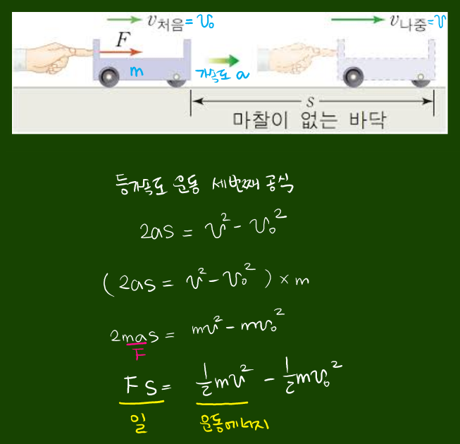 물체에 힘 F가 작용하여 물체가 힘의 방향으로 s만큼 이동했을 때 힘 F는 물체에 Fs만큼의 일을 했다.