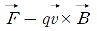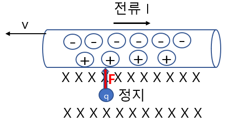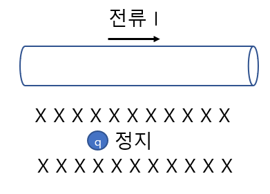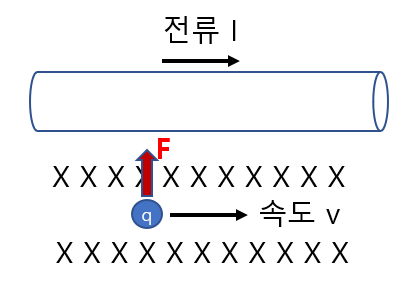 전류는 지면 아래로 들어가는(X) 자기장을 만든다. 움직이는(v) 전하(q)는 자기장(B) 내에서 다음과 같은 자기력(F)을 받는다.