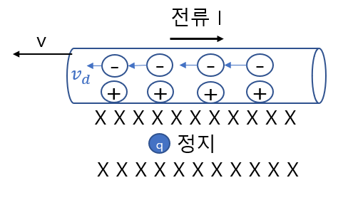 도선에 전자와 양전하가 있다고 하자. 전류가 오른쪽으로 흐르는 이유는 전자가 왼쪽으로 움직이기 때문이고, 이때 전자의 이동 속도를 vd라고 하자. 양전하는 정지해 있다. A 입장에서는 도선이 반대 방향, 왼쪽으로 v라는 속도로 움직인다. 그러면 A 입장에서 전자의 속도(vd+v)가 양전하의 속도(0+v)보다 빠르다. 특수 상대성 이론에 따르면 속도가 빠를수록 길이수축이 잘 일어난다. 따라서 전자간 간격이 양전하의 간격보다 더 수축하여 결과적으로 q입장에서 도선에 양전하보다 전자가 촘촘히 분포하게 된다. 즉, q입장에선 도선이 (-)로 대전된 물체가 된다.