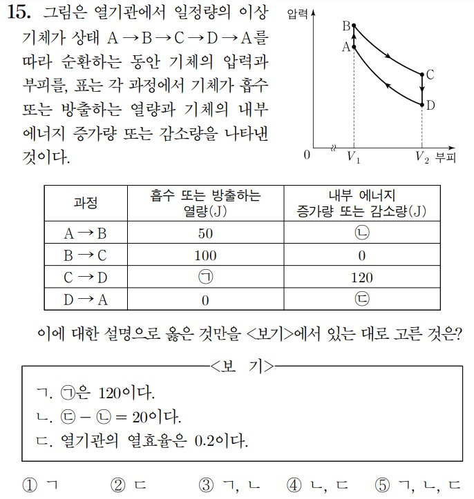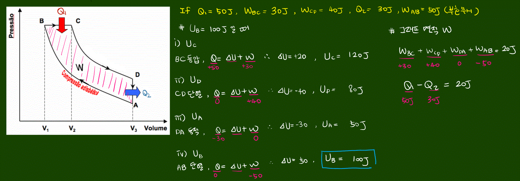 열기관이 한 번의 순환 과정을 거치면 다시 원래의 상태로 되돌아오므로, 한 번의 순환 과정 동안 열기관의 내부 에너지는 변화가 없다.
