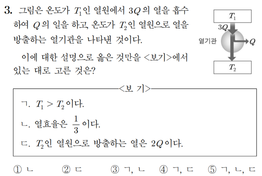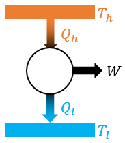 열은 온도가 높은 물체에서 온도가 낮은 물체로 이동하는 에너지다. 열기관은 이 흐름을 이용해서 열의 일부를 일로 전환한다. 이때 열기관의 열효율은 다음과 같다.