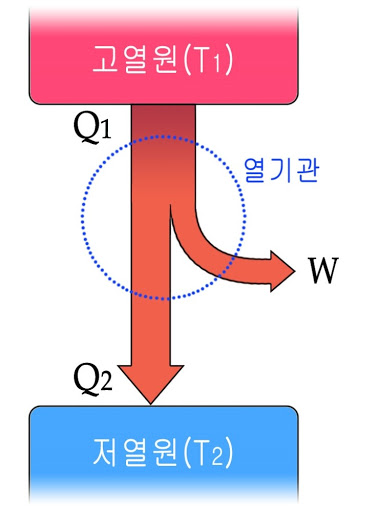 열기관은 열(Q1)을 흡수하여 그 일부를 일(W)로 바꾸어 주는 장치이다. '에너지 보존 법칙'에 의하면 열을 모두 일로 바꿀 수 있지만 실제 기관은 투입된 열의 일부만이 일로 바뀐다. 그 이유가 무엇일까?