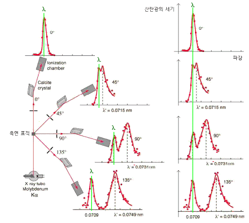 고전적 관점에 따르면 산란되는 엑스선의 파장은 입사하는 엑스선의 파장과 같아야 하는데, 산란된 엑스선은 일정한 파장 영역에 두 개의 뚜렷한 봉우리들을 갖고 있음을 볼 수 있다. 이때 두 개의 뚜렷한 봉우리 간격은 엑스선이 산란되는 방향의 각이 커짐에 따라 늘어나는 것을 확인할 수 있다.