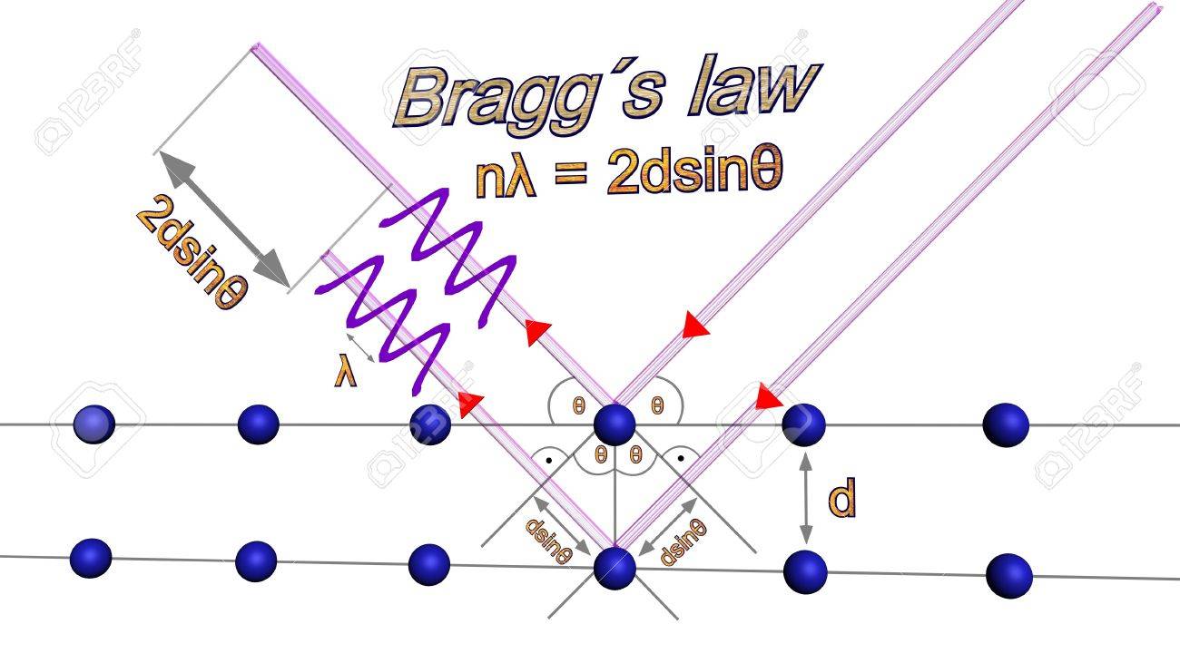 특정 각도로 입사한 전자가 강한 회절 무늬를 나타내는 브래그 회절 조건이다. 니켈 결정의 d는 X선을 이용한 분석에서 0.91옴스트롱임을 밝혀냈고, 특정각을 브래그 조건에 대입하면 n=1인 경우에 1.65옴스트롱이 나온다. 한편 전자의 가속 전압이 54V이므로 입사하는 전자는 54eV의 에너지를 가지고 드브로이 파장은 1.67옴스트롱이 나온다.