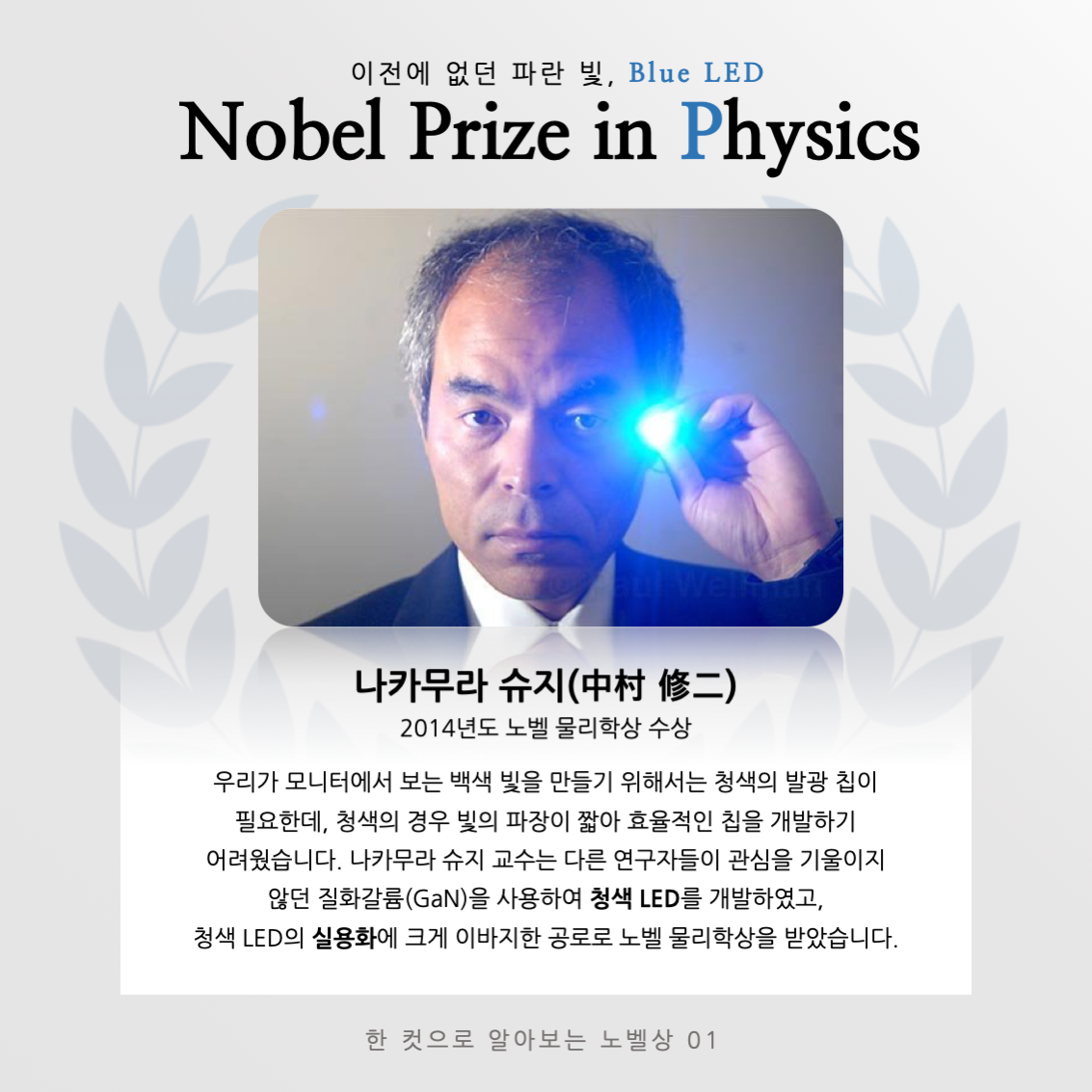 LED는 적, 녹, 청의 순서로 만들어졌습니다. 붉은빛보다 푸른빛에 가까울수록 빛 에너지가 커지다 보니 적색 LED보단 청색 LED가 만들기 어려웠죠. 적색 LED가 나오고 청색 LED가 나오는 데 무려 27년이나 걸렸습니다. 각고의 노력 끝에 나카무라 슈지를 포함한 일본 과학자들이 청색 LED를 만들었고, 이에 대한 공로로 2014년 노벨 물리학상을 받았습니다.