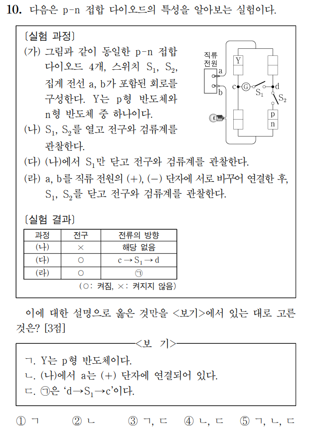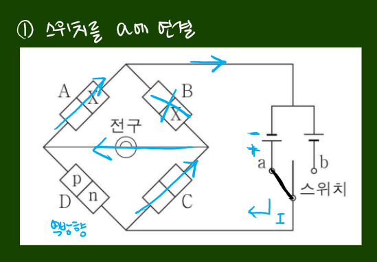 스위치를 a에 연결하면 D에 역방향 전압이 걸리므로 전류는 C로 흘러야 합니다. 즉 C에 순방향 전압이 걸립니다. A와 B는 위치상 둘 중 하나에 역방향 전압이 걸려야 할텐데, A에 역방향 전압이 걸린다면, B에 순방향 전압이 걸린다는 것이고, 그렇다면 B는 저항이 없는 전선이 되어버리기에 전류는 저항이 없는 B로 다 흘러버립니다. 그래서 전구에 불이 들어오지 않죠. 이는 문제 조건에 부합하지 않기에 전류는 전구를 지나 A로 흘러야만 합니다. 따라서 A에 순방향 전압이 걸리고 B에 역방향 전압이 걸려요. A에 순방향 전압이 걸린다는 것은 X가 n형 반도체라는 걸 의미합니다.