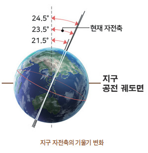 지구 자전축의 각도는 23.5º입니다. 이 각도는 21º에서 24º 범위에서 약 몇 만년 주기로 변한다고 하는데요. 지구 자전축의 기울기가 바뀐다면 그에 따라 지구 자기장 방향도 살짝 바뀌기 마련입니다.