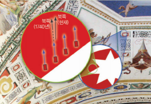 시간이 지나 염료가 굳어버리면서 그때 당시의 지구 자기장 방향이 적철석 염료에 고스란히 남아있을 수 있던 겁니다. 그림에서 확인할 수 있듯이 18세기와 지금의 지구 자기장 방향은 약 1도 가량 차이가 나요.
