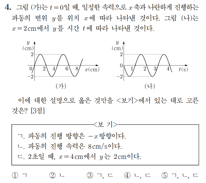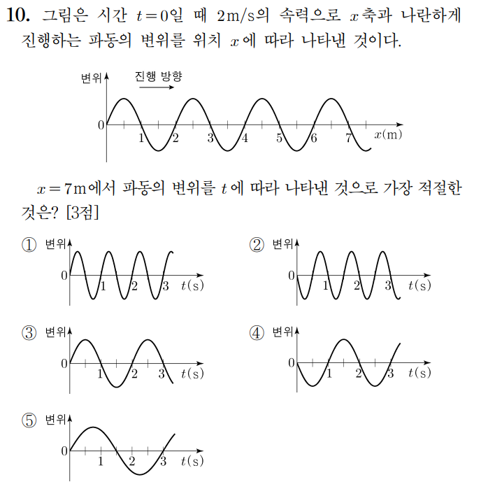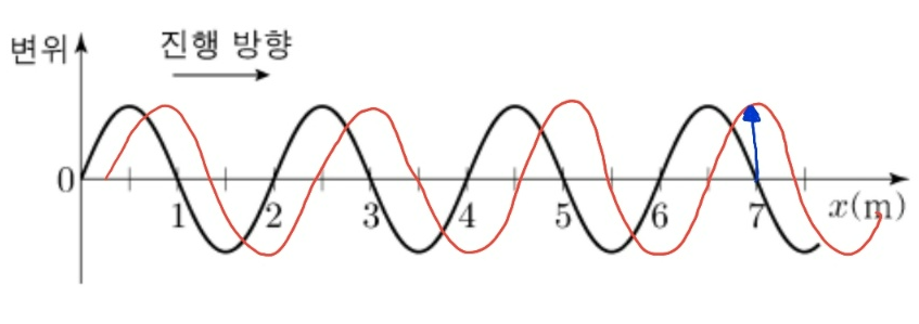 파동이 오른쪽으로 살짝 이동했을 때 x=7m인 지점의 변위는 위를 향합니다. 따라서 답은 1번입니다.