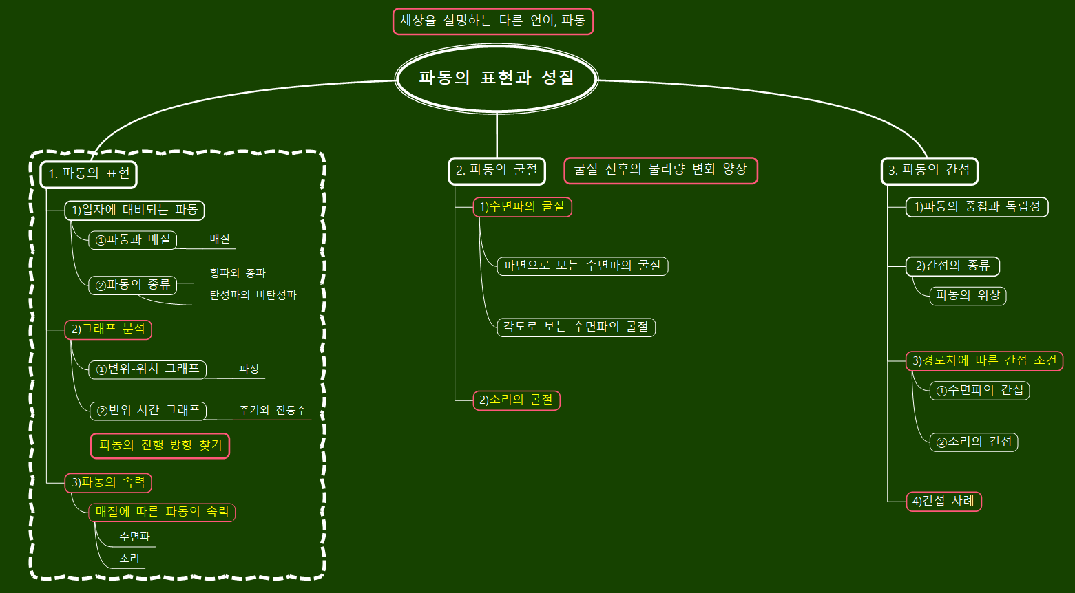 파동은 매질의 진동에 의해 에너지를 전달하는 형식이다 보니 매질을 구성하는 분자들의 결합 구조를 비롯한 매질의 물리적 특성이 파동의 이동에 영향을 줄 수밖에 없습니다. 물리학 1에서는 수심에 따른 수면파의 속력, 공기의 온도에 따른 소리의 속력을 다룹니다.
