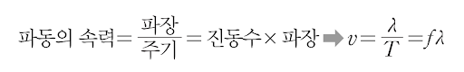 파동은 매질이 한 번 진동하는 동안 한 파장의 거리를 이동합니다. 따라서 파동의 속력은 파장을 주기로 나눠서 구합니다.