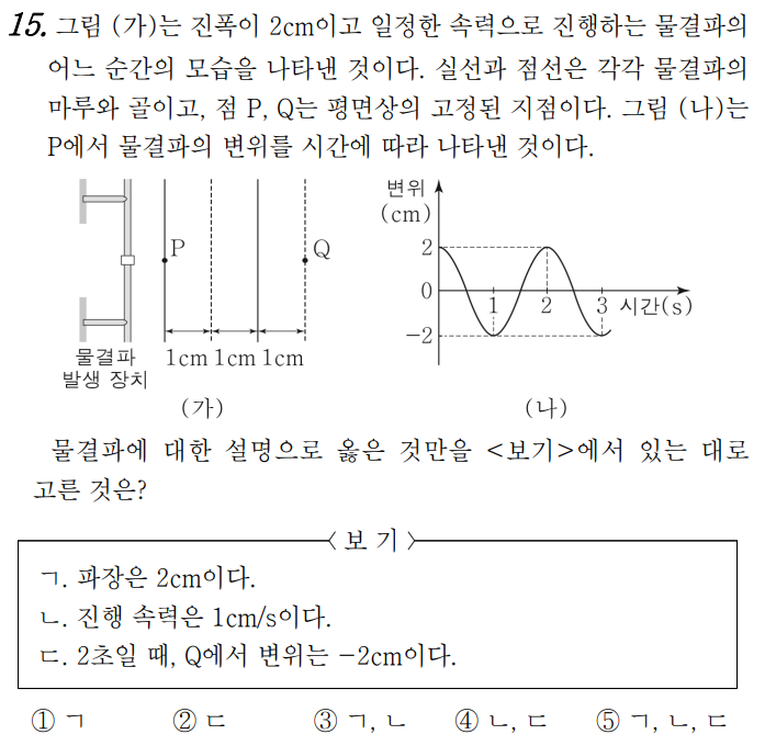①문제에 주어진 그래프는 '변위-위치 그래프'이므로 파동의 파장을 알 수 있습니다. 파장 λ은 2m입니다. 파동의 속력이 2m/s이기 때문에 이 파동의 주기 T는 1초입니다. 보기의 그래프는 모두 '변위-시간 그래프'이므로 주기가 2초인 3, 4번과 주기가 3초인 5번은 답에서 제외됩니다.