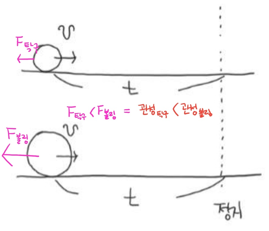 예를 들어 같은 속력 v로 움직이는 볼링공과 탁구공이 있습니다. 이 두 공에 힘을 작용하여 정지시키고자 합니다.