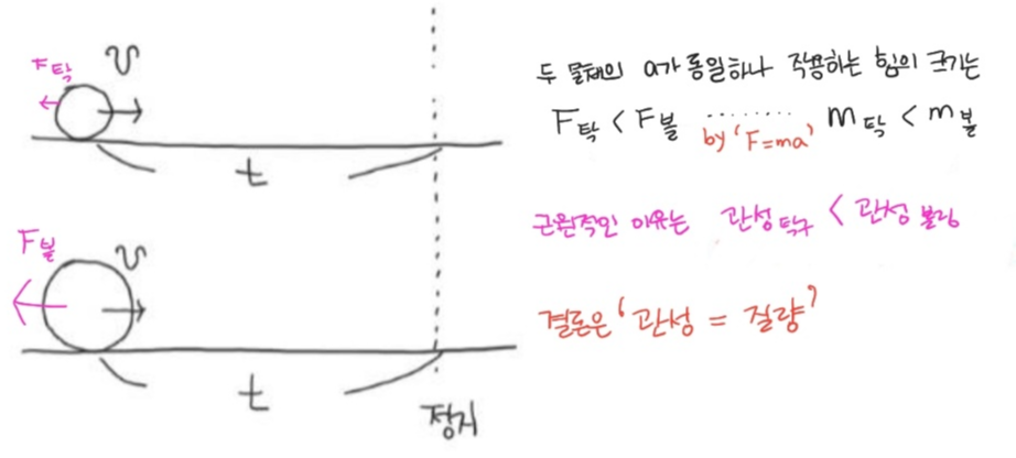 하지만 두 공은 '관성'이라는 본연의 성질 때문에 운동 상태를 유지하려 할 것입니다. 경험상 탁구공을 멈추는 것보다는 볼링공을 정지시키는 데 더 큰 힘을 주어야 함을 잘 알고 있습니다. 이는 볼링공의 관성이 탁구공의 관성보다 크다는 걸 뜻해요.
