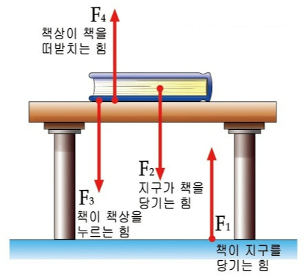 책뿐만 아니라 책상도 정지해있으니 책상에 작용하는 힘들의 관계도 살펴봅시다.