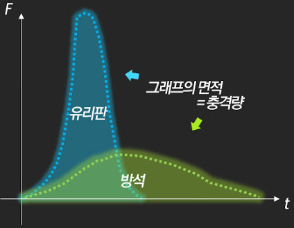 달걀이 방석에 떨어질 때에는 운동량이 변화(mv→0)하는 데 걸리는 시간이 상대적으로 더 길고 달걀이 유리판에 떨어질 때에는 운동량이 변화(mv→0)하는 데 걸리는 시간이 상대적으로 짧아서 그렇습니다. 이를 그래프로 나타내면 다음과 같아요.