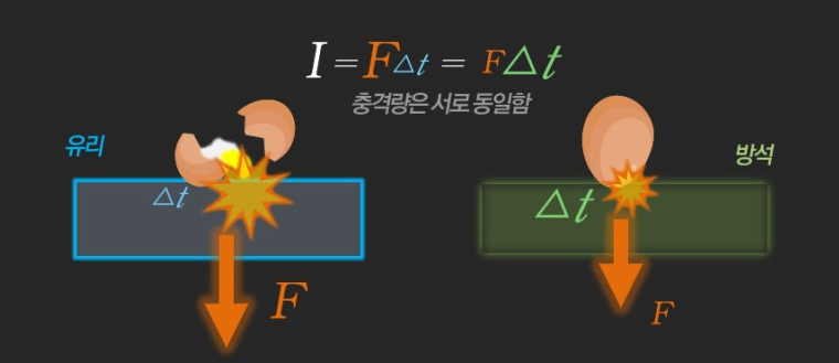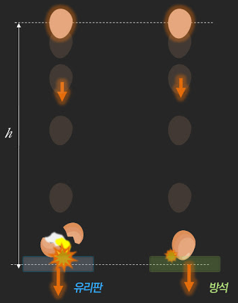 달걀이 유리판에 떨어지든 방석에 떨어지든 충격을 받는 양(=충격량)이 동일함에도 불구하고 유리판에 떨어지는 달걀만 깨지는 이유는 무엇일까요? 힘이란 물체의 모양을 변화시키는 원인입니다. 더 극적인 모양 변화를 일으키기 위해서는 더 큰 힘이 필요하겠죠? 이는 유리판에 떨어져 깨진 달걀에 그만큼 더 큰 힘 F가 가해졌다는 걸 뜻합니다. 그렇다면 유리판이 달걀에 작용하는 힘 F가 방석이 달걀에 작용하는 힘 F보다 큰 이유는 무엇일까요?