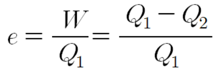 열은 온도가 높은 물체에서 온도가 낮은 물체로 이동하는 에너지입니다. 열기관은 이 흐름을 이용해서 열의 일부를 일로 전환해요. 이때 열기관의 열효율은 다음과 같습니다.